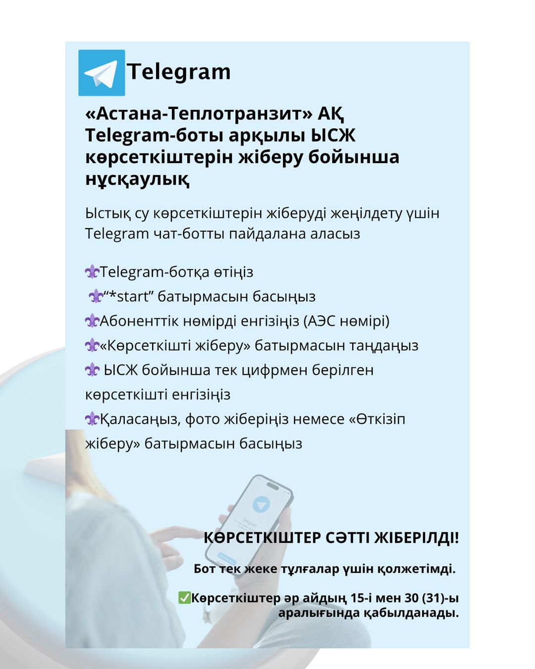 «Жылу энергетикасы туралы» Қазақстан Республикасының заңнамасына (бұдан әрі – Заң) енгізілген өзгерістерге байланысты 2025 жылғы 1 шілдеден бастап «Астана – Теплотранзит» АҚ тұтынушыларға жылу энергиясын өткізуді жүзеге асырады.