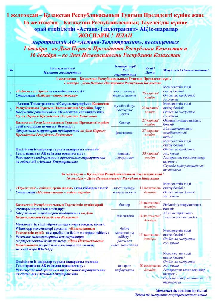 16 желтоқсан – Қазақстан Республикасының Тәуелсіздік күніне орай «Астана-Теплотранзит» АҚ мемлекеттік тілді енгізу бөлімі жыл сайынғы бекітілген Іс-шаралар жоспарына сәйкес 2020 жылғы 11-15 желтоқсан аралығында мерекелік іс-шара ұйымдастырды.