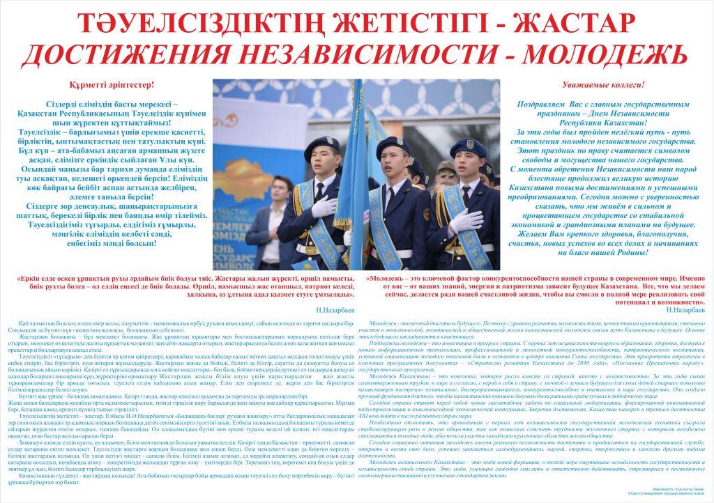 1) Еліміздің Тұңғыш Президенті Н.Ә.Назарбаев жастарға ерекше назар аударатын, себебі еліміздің болашағы – жастар. Ол әрқашан жастарды қолдап, жастар саясатын дамытты. 2019 жыл елімізде Жастар жылы деп аталған болатын. Осыған орай мемлекеттік тілді енгізу бөлімі Тәуелсіздік күніне арналған «Тәуелсіз елдің болашағы – жастар!» тақырыбында қабырға газетін шығарды.