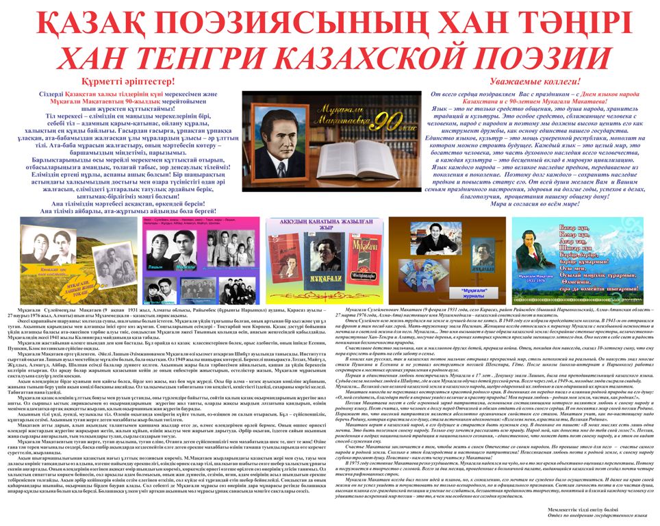 - Бекітілген Іс-шаралар жоспарына сәйкес Мұқағали Мақатаевтың 90 жылдығына орай мемлекеттік тілді енгізу бөлімі «Қазақ поэзиясының Хан Тәңірі» тақырыбындағы қабырға газетін шығарды.