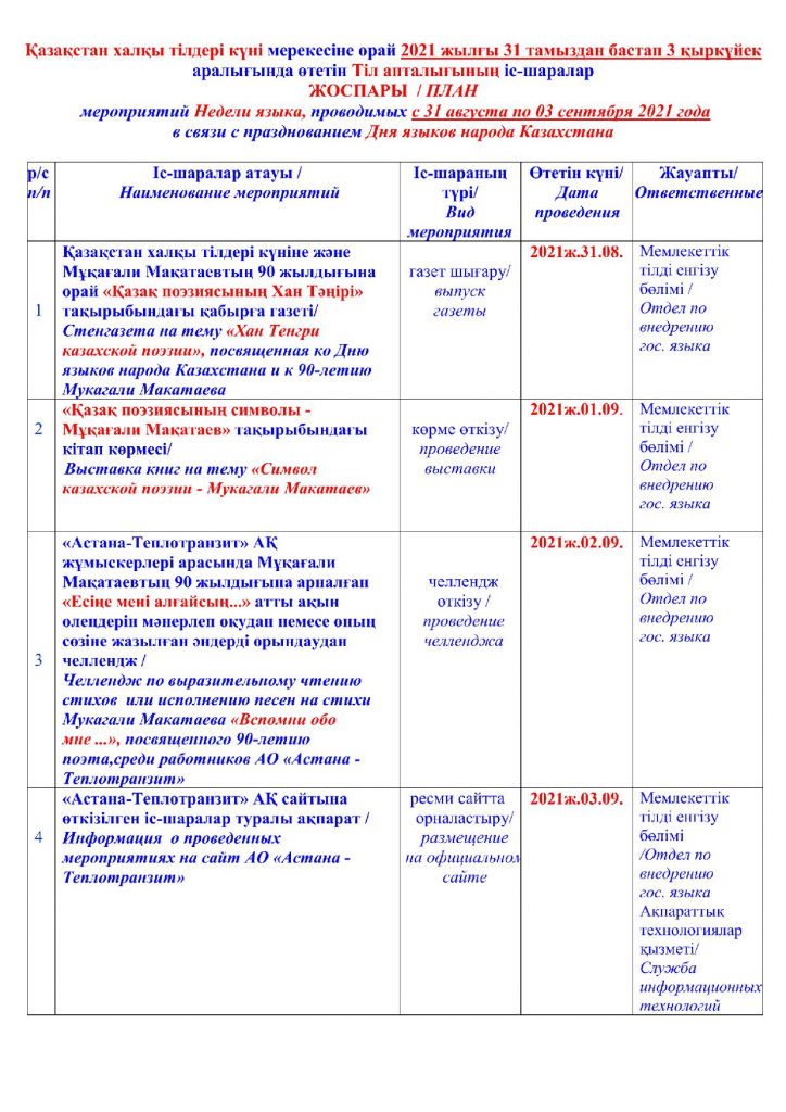 Отделом по внедрению государственного языка АО «Астана — Теплотранзит» был утвержден ежегодный План мероприятий на 5 сентября — ко Дню языков народа Казахстана и были организованы мероприятия в период с 31 августа по 3 сентября 2021 года согласно указанного плана.