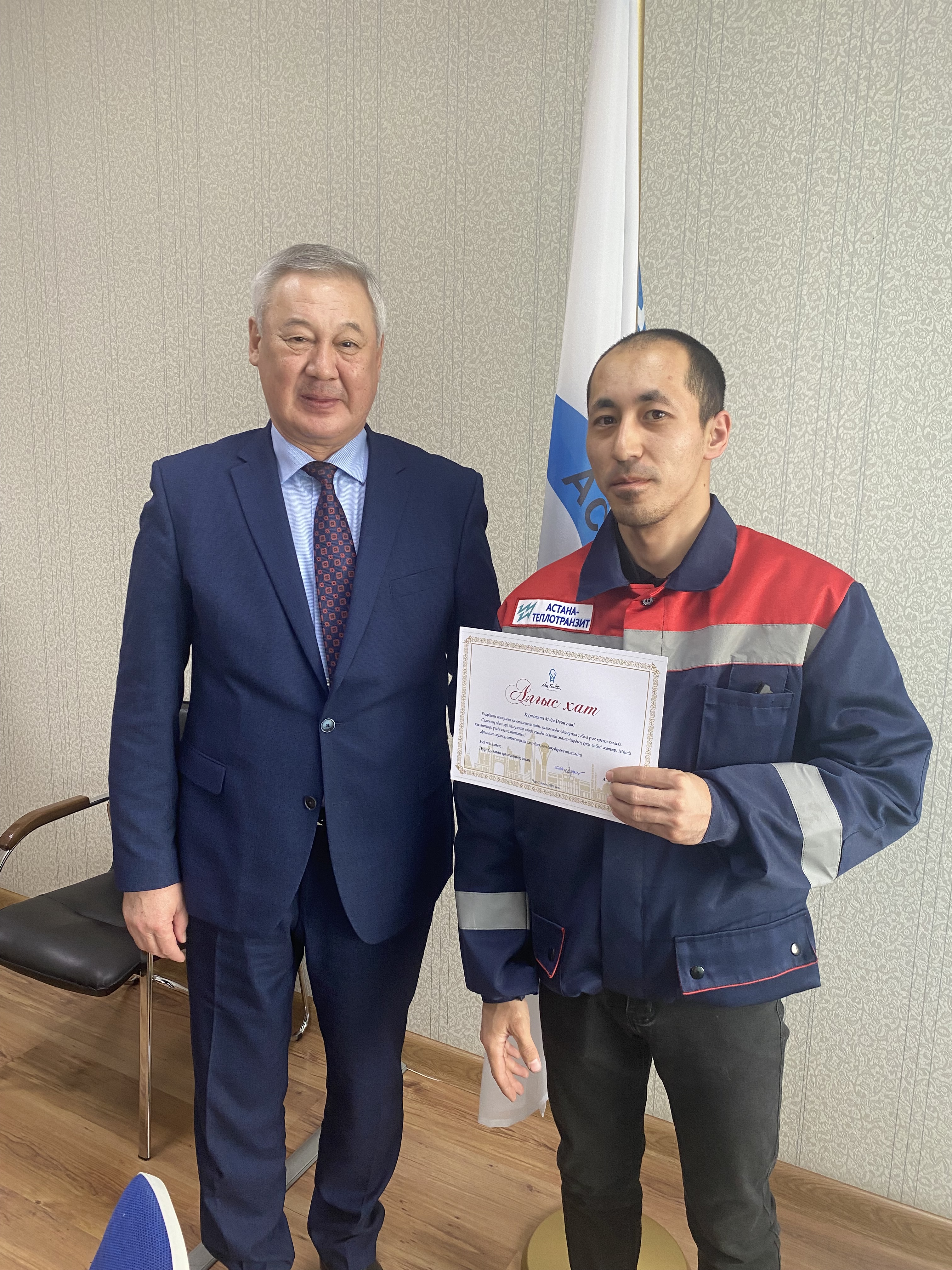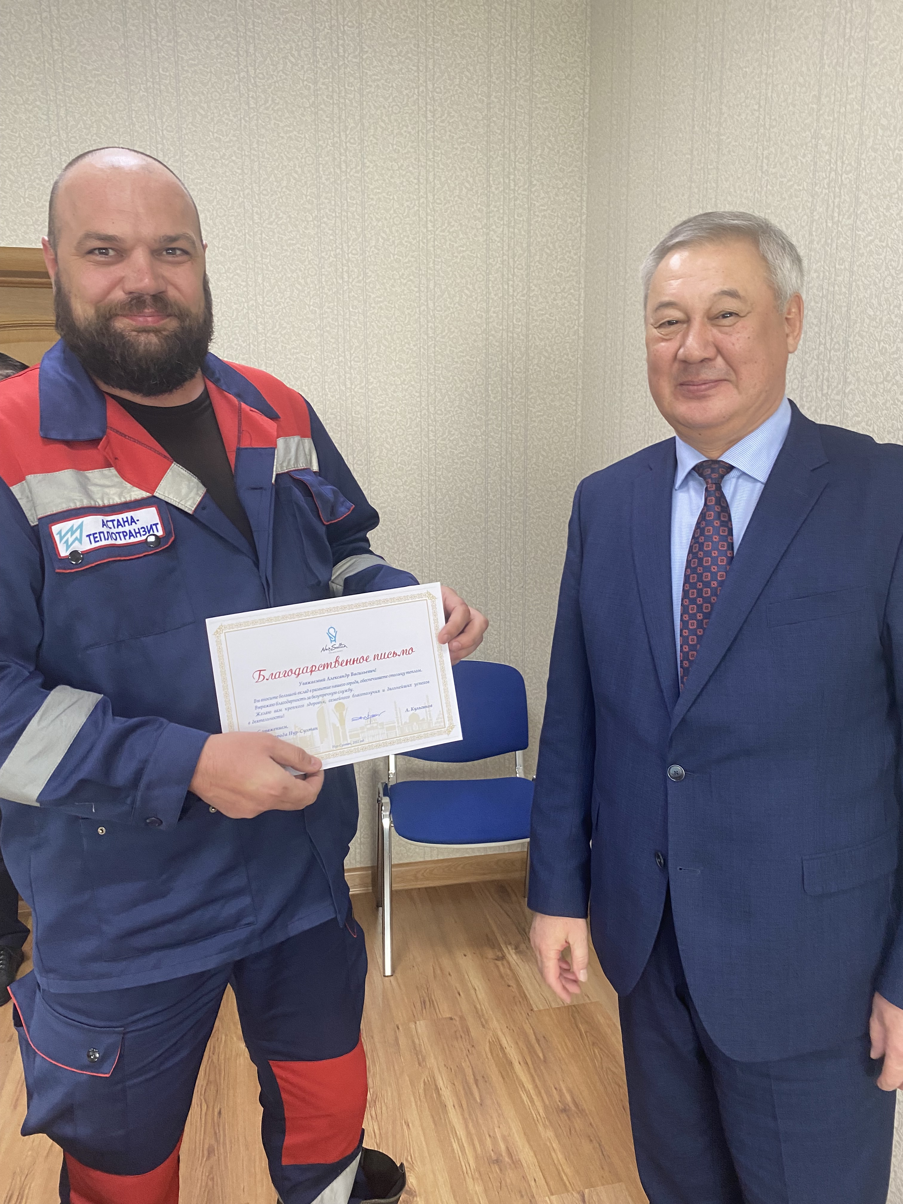 Заместитель акима города Нур-Султан Ермек Ануарбекович Кизатов поздравил работников АО «Астана-Теплотранзит» с успешным завершением отопительного сезона. Ермек Ануарбекович пожелал коллективу успехов в работе и наградил благодарственными письмами от акима города Нур-Султан за проделанную работу.