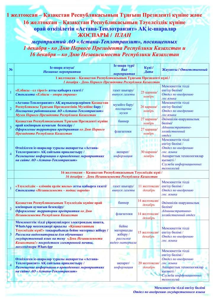 16 декабря — ко Дню Независимости Республики Казахстан отделом по внедрению государственного языка АО «Астана-Теплотранзит» было организовано праздничное мероприятие с 11 по 15 декабря 2020 года, согласно ежегодного утвержденного Плана мероприятий.