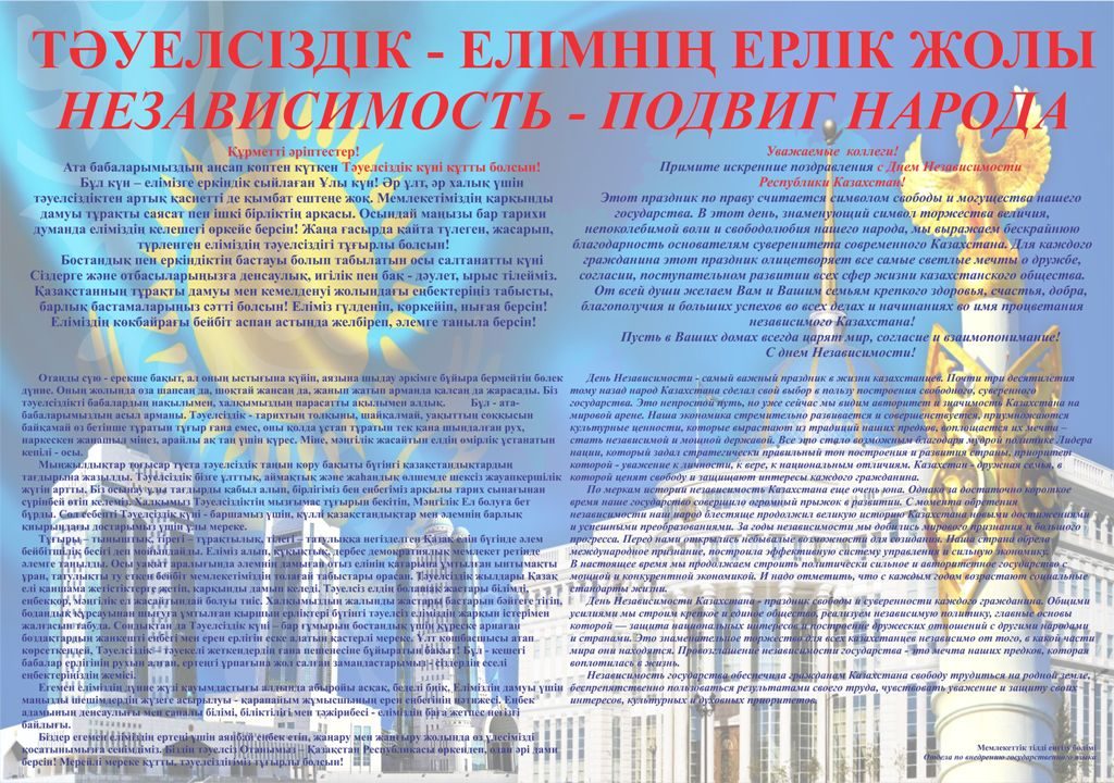 1) Отделом по внедрению государственного языка была выпущена стенгазета на тему «Независимость – подвиг народа!» ко Дню Независимости Республики Казахстан.