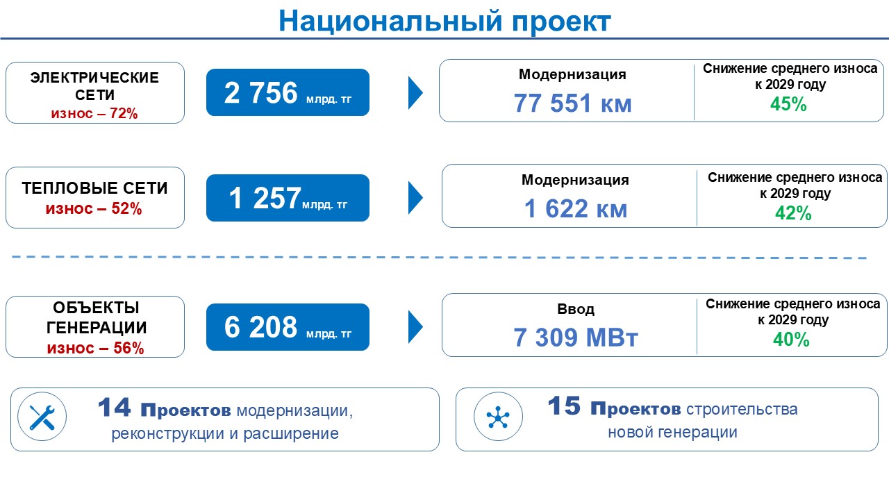 — На 36 проектов в сфере источников энергии предусмотрено 39 млрд тенге, на 21 проект по теплосетям — 22,1 млрд тенге, на 17 проектов по электроснабжению — 18,1 млрд тенге, и на 15 проектов по газификации — 20,2 млрд тенге, — сообщил Нурлан Копешов.