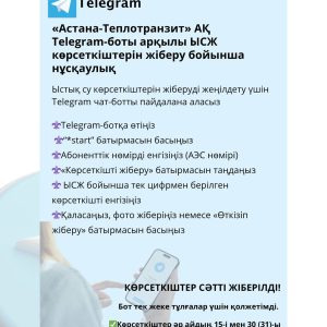 «Астана-Теплотранзит» АҚ Астана қаласы әкімдігінің 2025 жылғы 26 қыркүйектегі № 509-3471 қаулысына сәйкес, 2014 жылғы 27 маусымдағы № 249/36-V «Астана қаласында жылыту маусымына дайындық және оны өткізу қағидасының» 32-тармағы негізінде 2025 жылғы 28 қыркүйектен бастап 2025-2026 жылдардағы жылыту маусымының басталуы туралы хабарлайды.